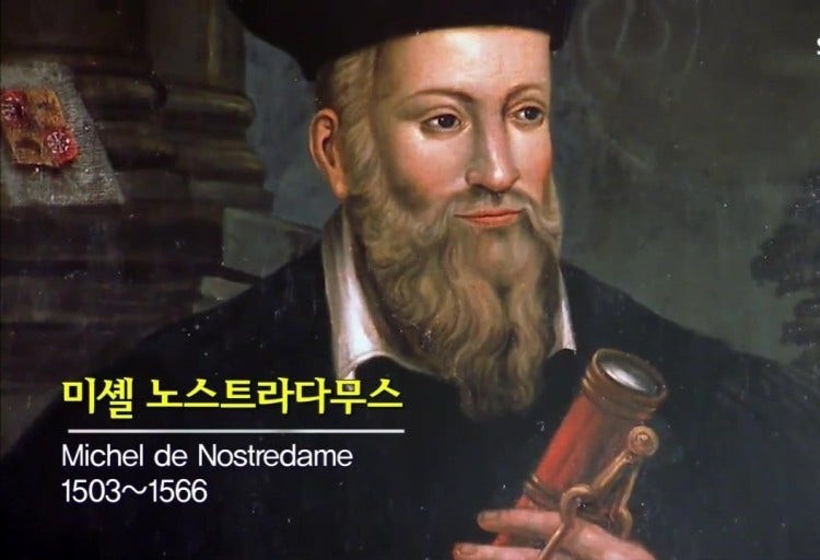 미셸 드 노스트라다무스(Michel de Nostradamus, 1503~1566)는 프랑스의 의사, 점성술사, 예언자로, 그의 예언서 *레 프로페티(Les Prophéties)*는 수백 년 동안 전 세계적으로 논란과 매혹의 중심에 있었다. 16세기 르네상스 시대에 활동한 그는 과학, 의학, 점성술, 그리고 신비주의를 융합해 미래를 예견했다고 주장했다. 그의 예언은 모호한 4행시(쿼트레인, quatrain)로 쓰여졌으며, 현대에 이르기까지 히틀러의 등장, 9·11 테러, 심지어 팬데믹 같은 사건들과 연관 지어 해석된다.