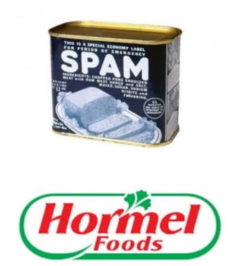 스팸은 1970년 영국 코미디 그룹 몬티 파이튼의 스케치로 전 세계에 이름을 알렸다. 이 스케치에서 식당 메뉴에 스팸이 과도하게 들어가 “원치 않는데 잔뜩 있는 것”으로 묘사되었다. 이 이미지는 1980년대 인터넷 시대에 “원치 않는 전자 메시지”를 “스팸 메일”이라 부르는 계기가 되었고, 오늘날까지 이어진다.